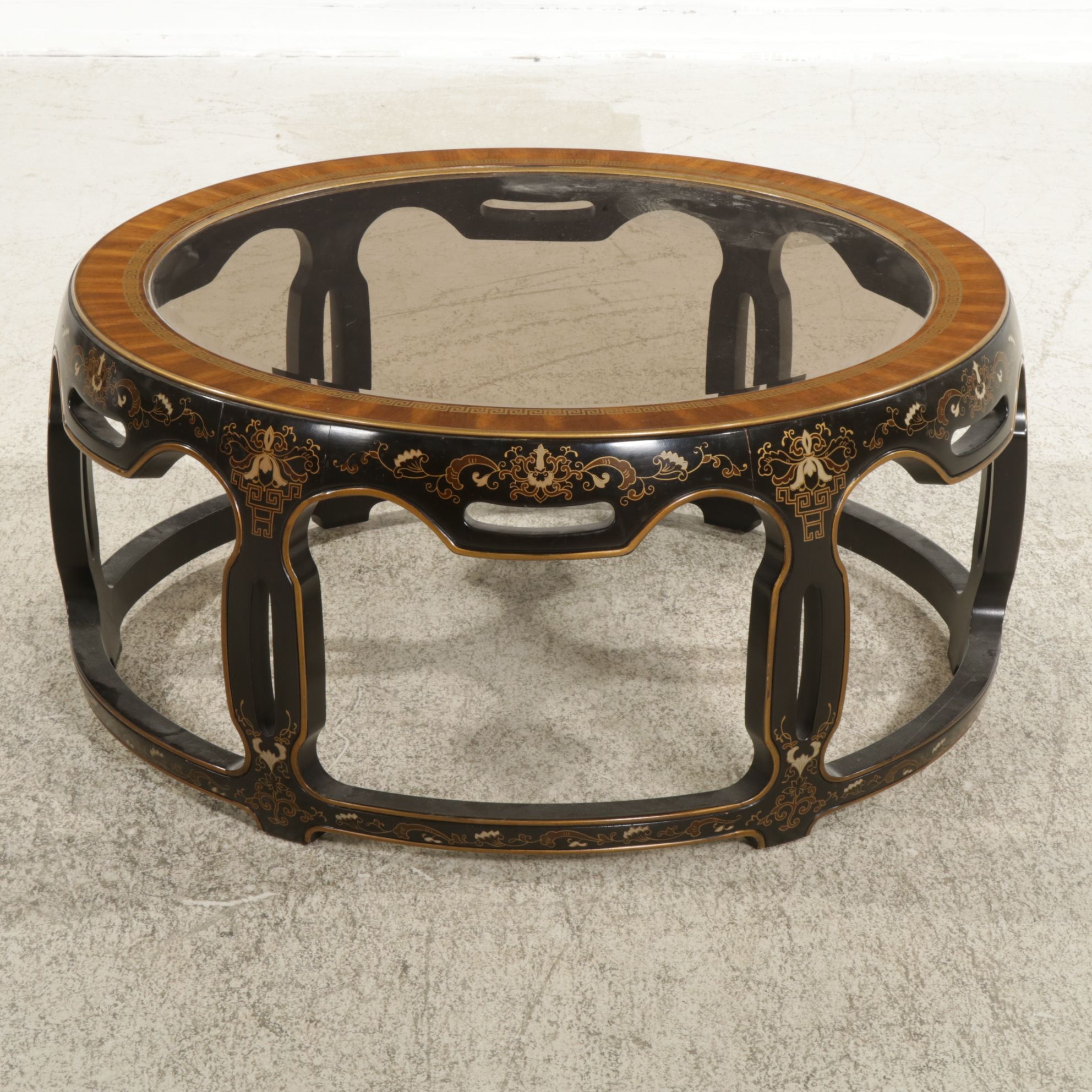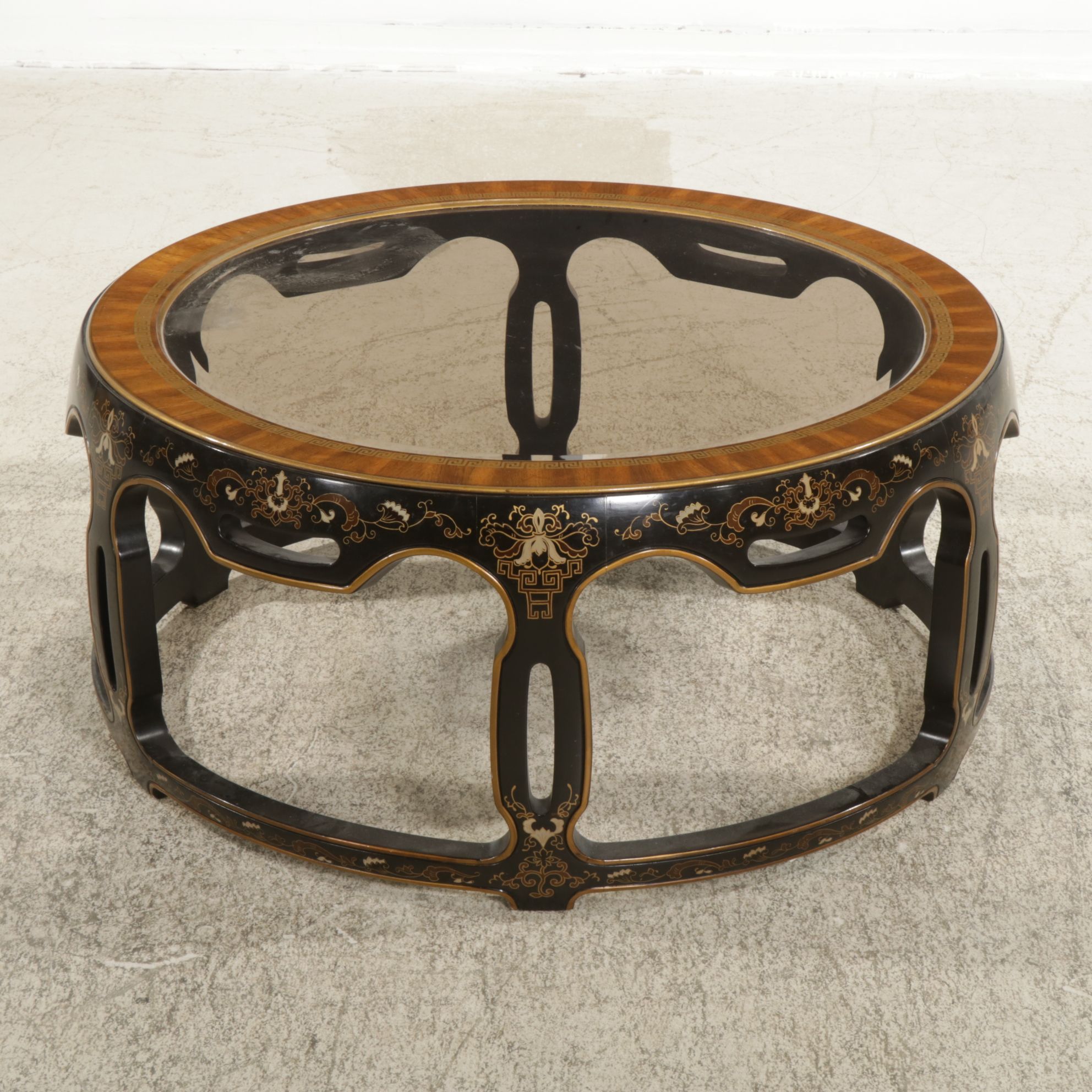 Drexel Chinoiserie Ebonized Wood and Mahogany Glass Top Round Coffee ...