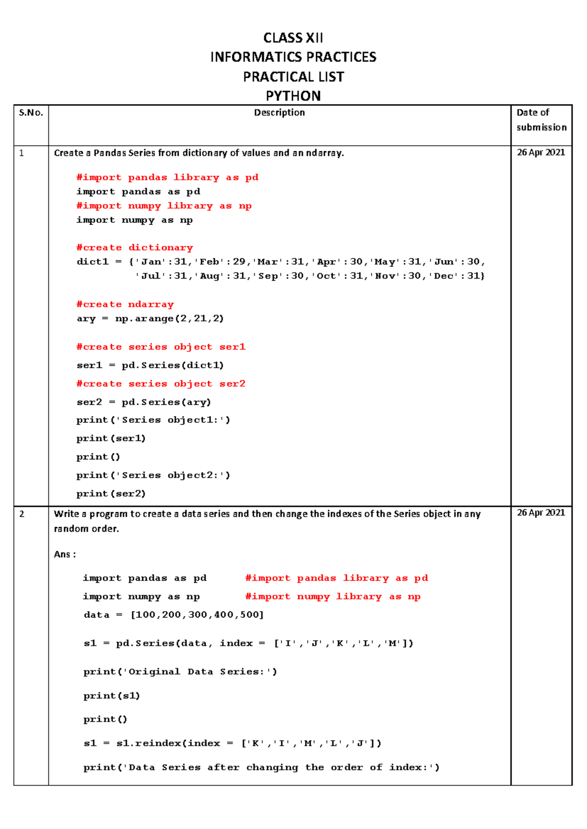 Class XII - Informatics Practices Practical File 2022 - Python Tasks ...