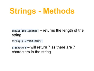 String methods - Java - STRING METHODS Length : The length is the ...