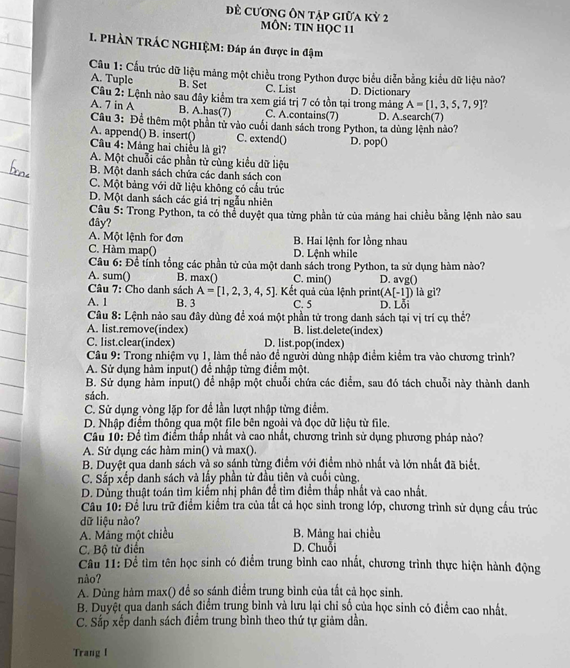 Giải quyết:đề cương Ôn tập giữa kỳ 2 MÔN: TIN HỌC 11 I. PHÀN TRÁC ...