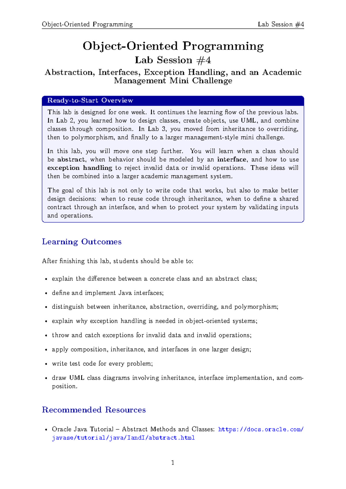 Lab 4 - Programming Lab Session: Abstraction, Interfaces, and Exception ...