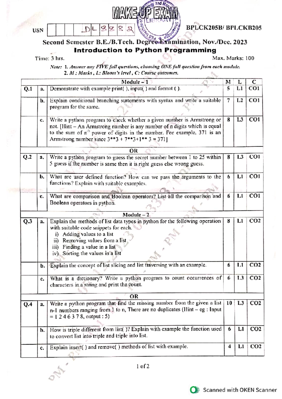 MAKE UP EXAM USN I PES BPLCKB205: Intro to Python Programming - Studocu