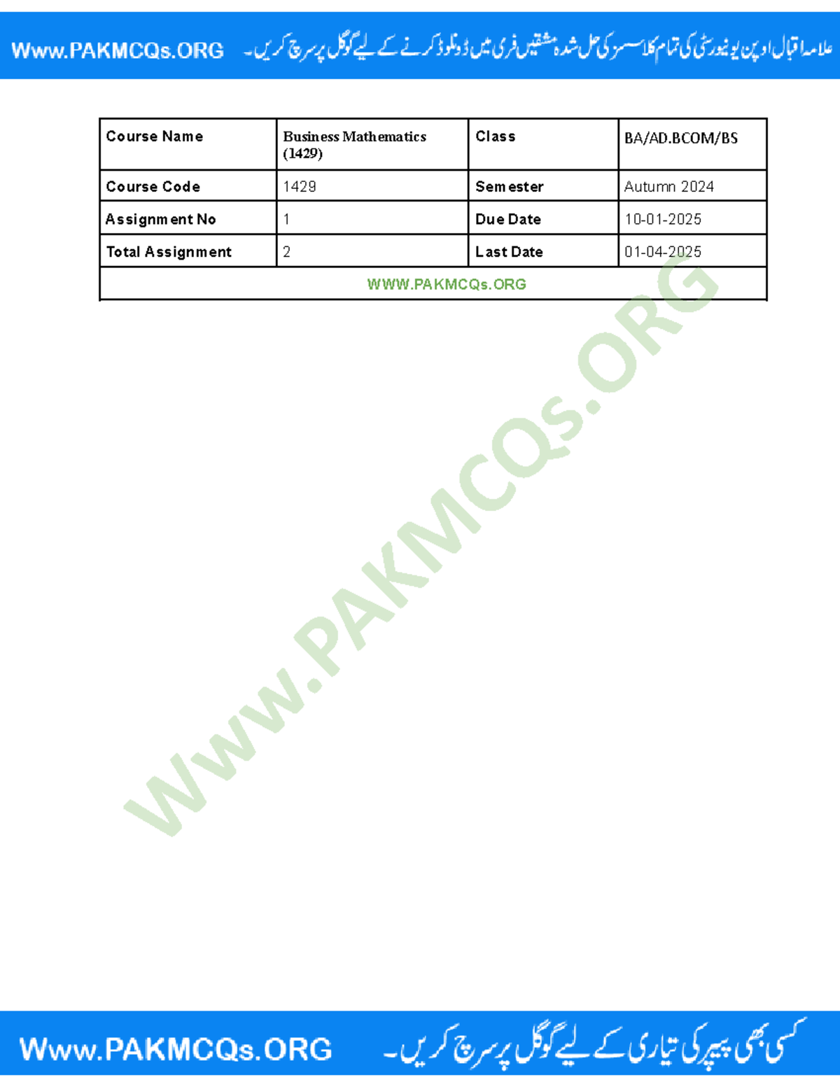 Business Mathematics Code 1429 Solved Assignments Spring 2025 ~ PakMcqs ...
