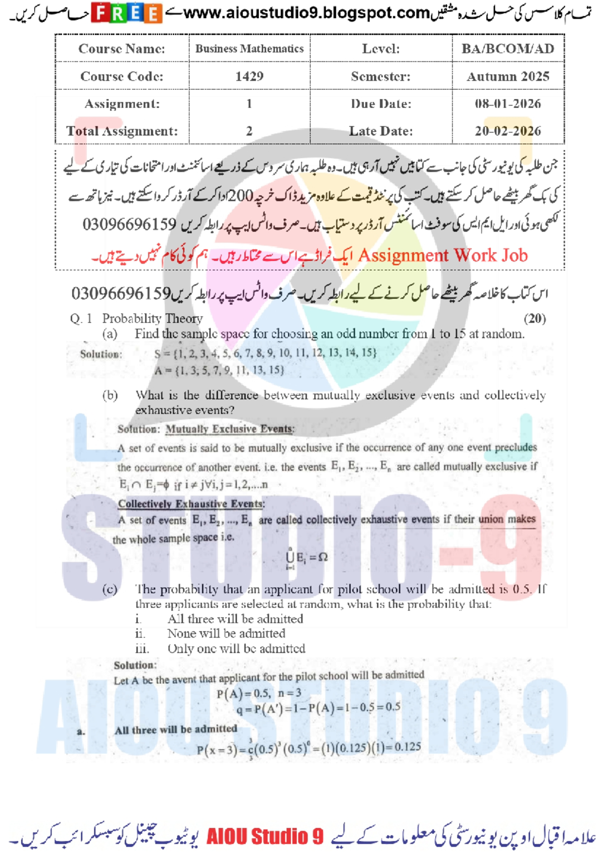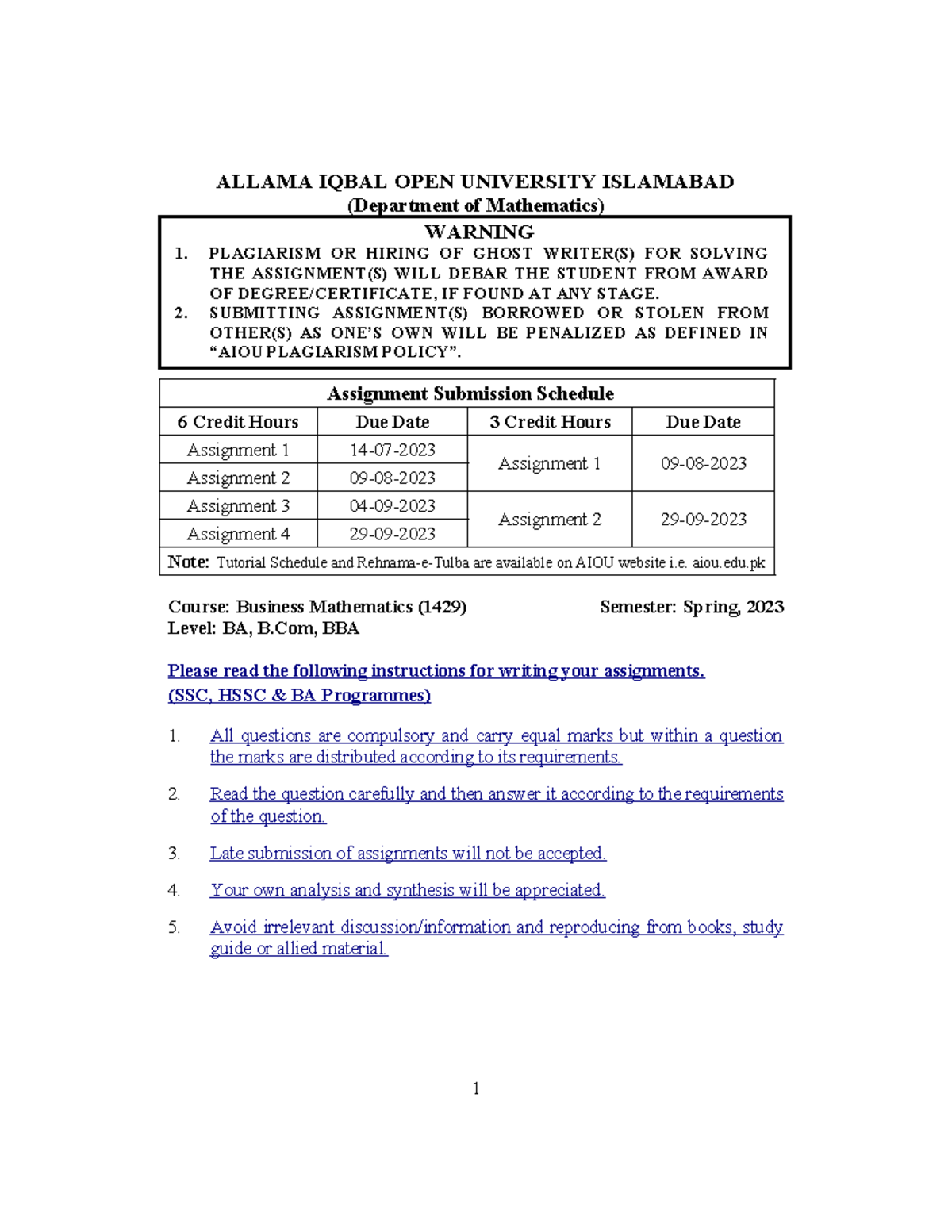 Business Mathematics Code 1429 AIOU Free Solved Assignment Program BA ...