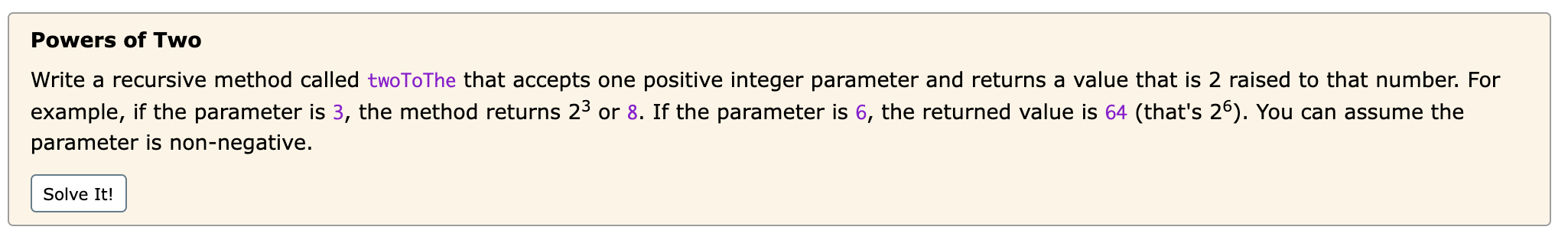 1. Write a recursive Java method that can find the n-th power of two (2 ...