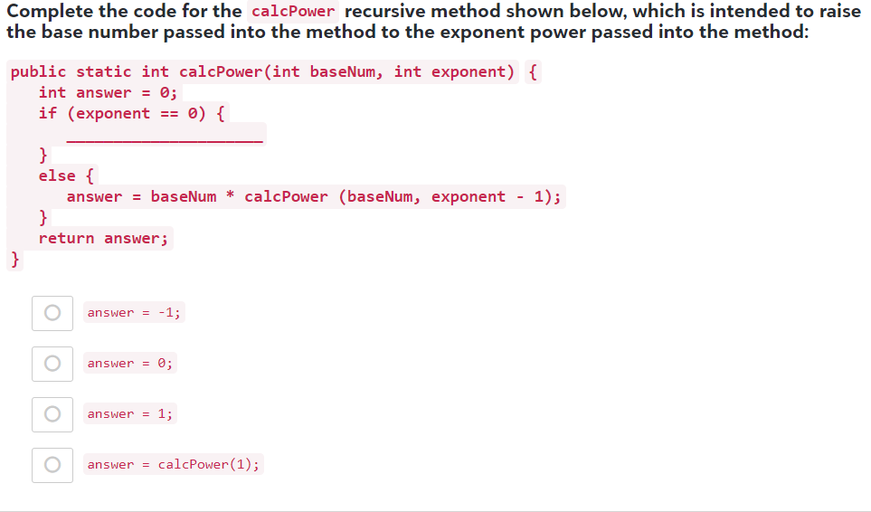 Solved Complete the code for the calcPower recursive method | Chegg.com