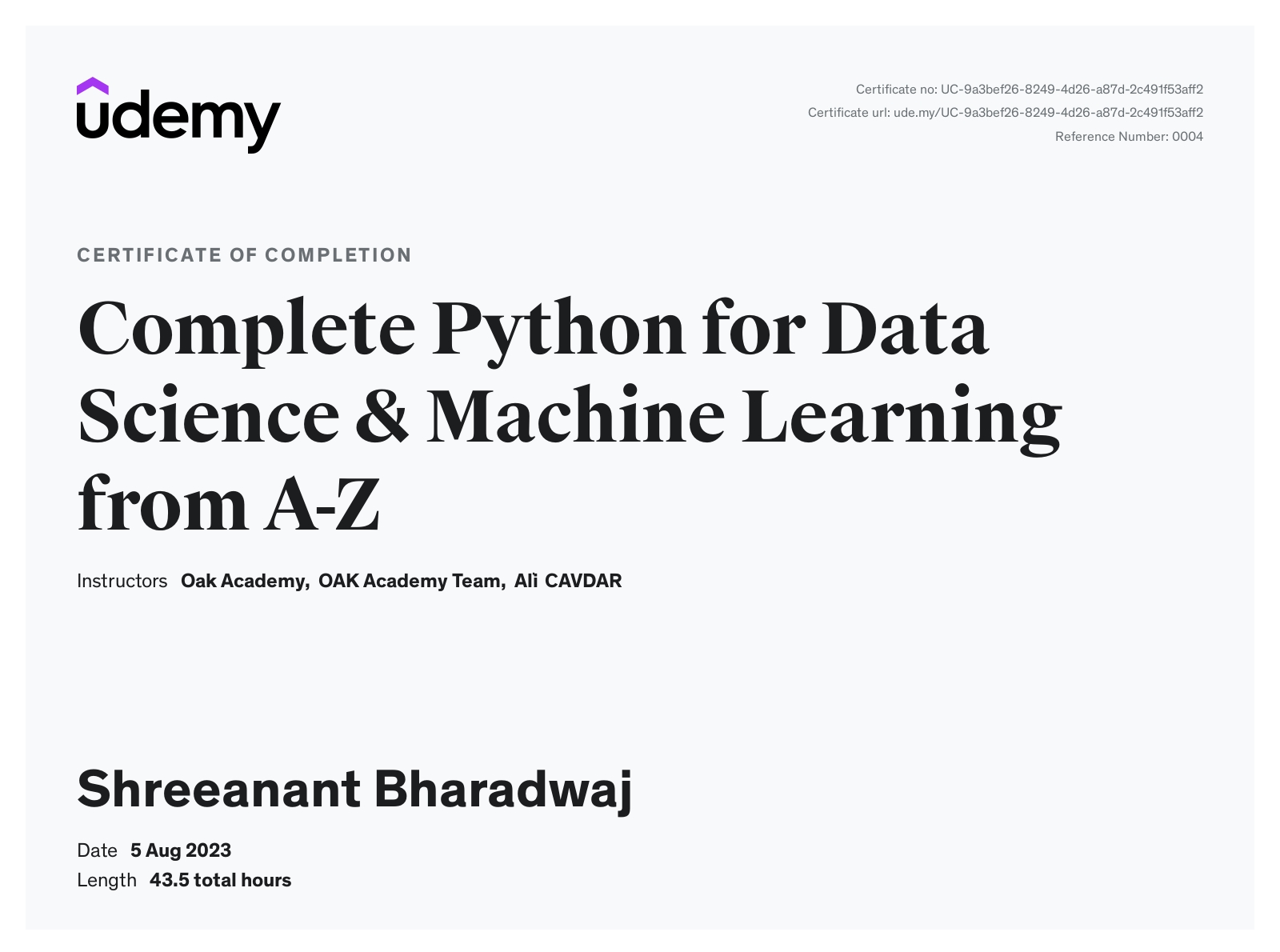 Completed Python for ML & Data Science Masterclass | Subrat Pandey ...