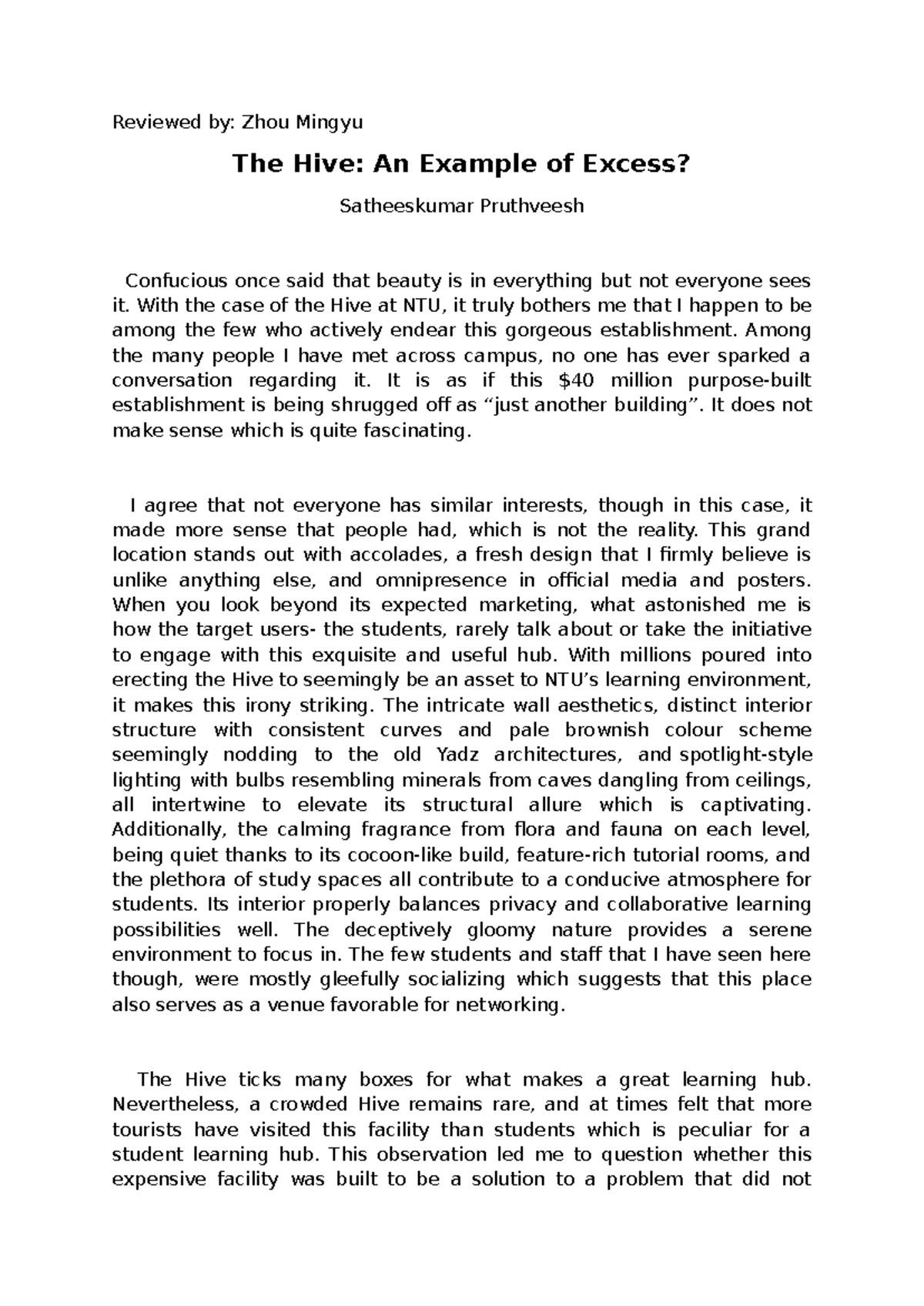 CC1 Op-ed Draft 1: The Hive at NTU - A Beautiful Yet Underappreciated ...