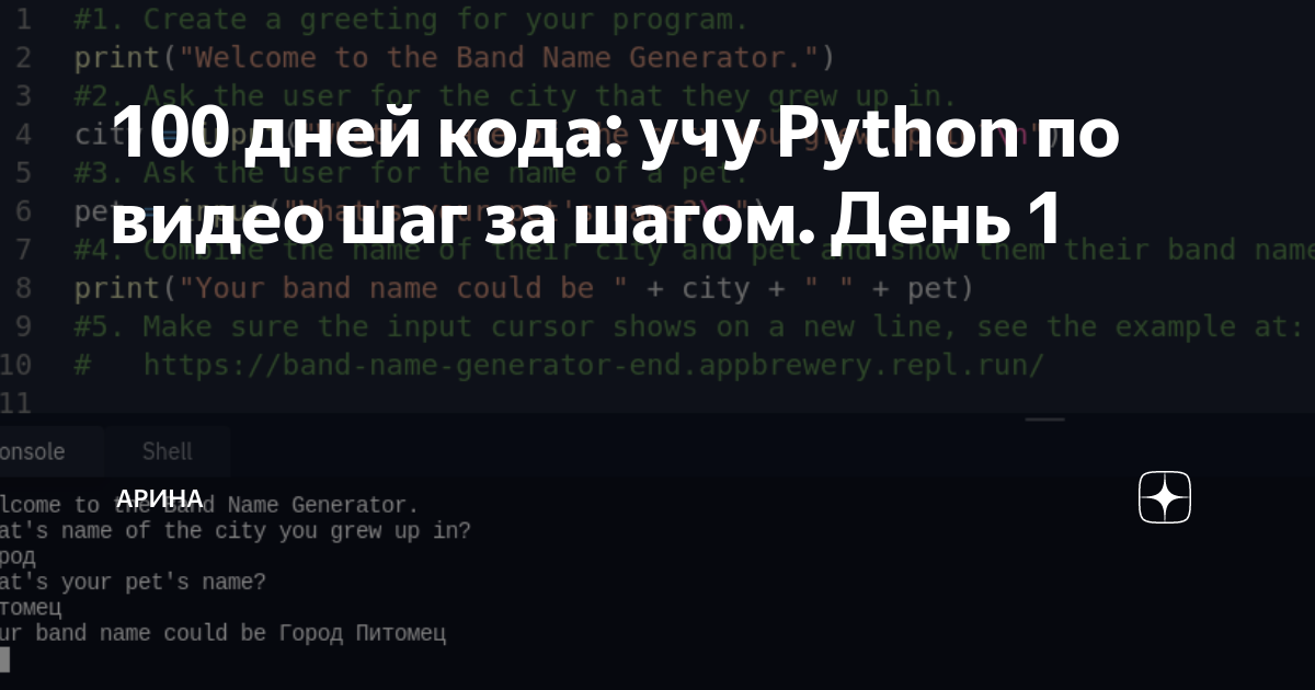100 дней кода: учу Python по видео шаг за шагом. День 1 | Арина | Дзен