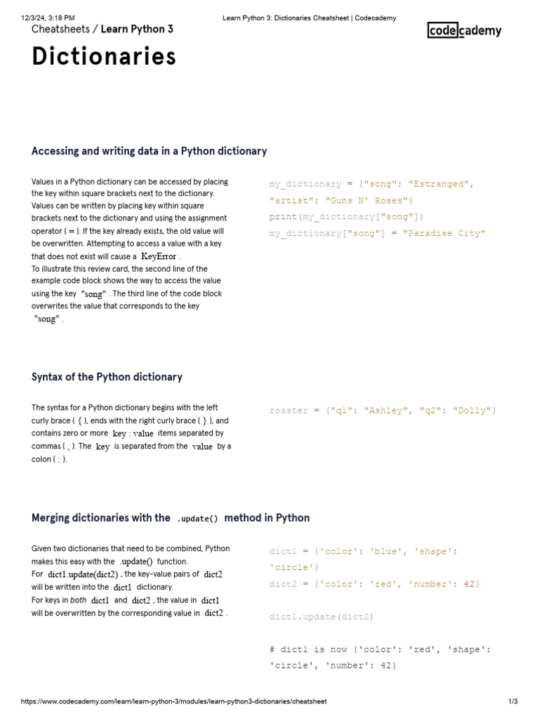 Learn Python 3 - Dictionaries Cheatsheet - Codecademy | PDF | Data Type ...