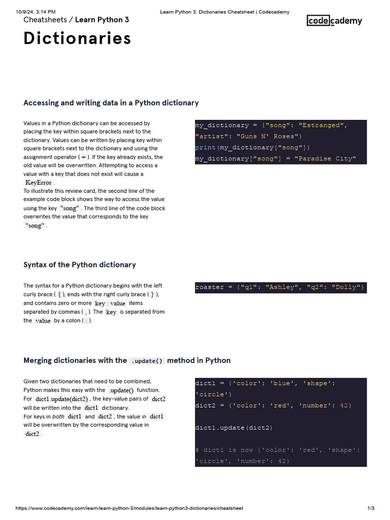 Learn Python 3 - Dictionaries Cheatsheet - Codecademy | PDF