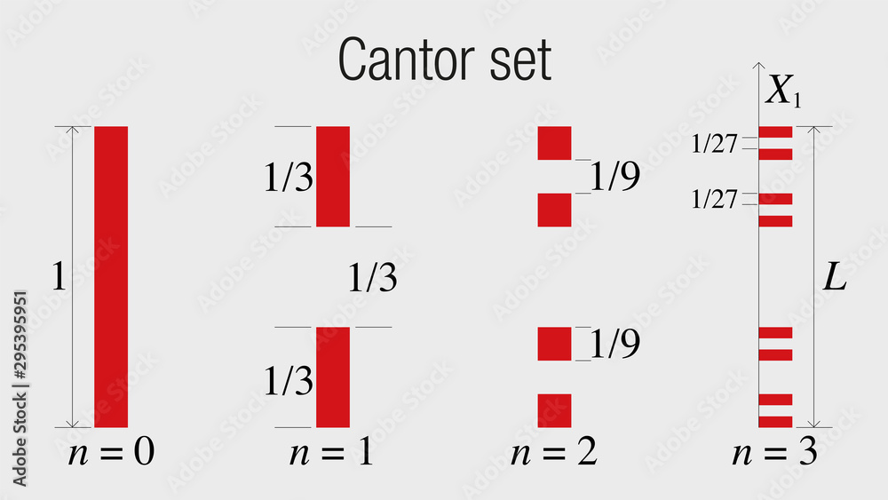 CANTOR SET. Fractal geometry exercise in red and black color on white ...