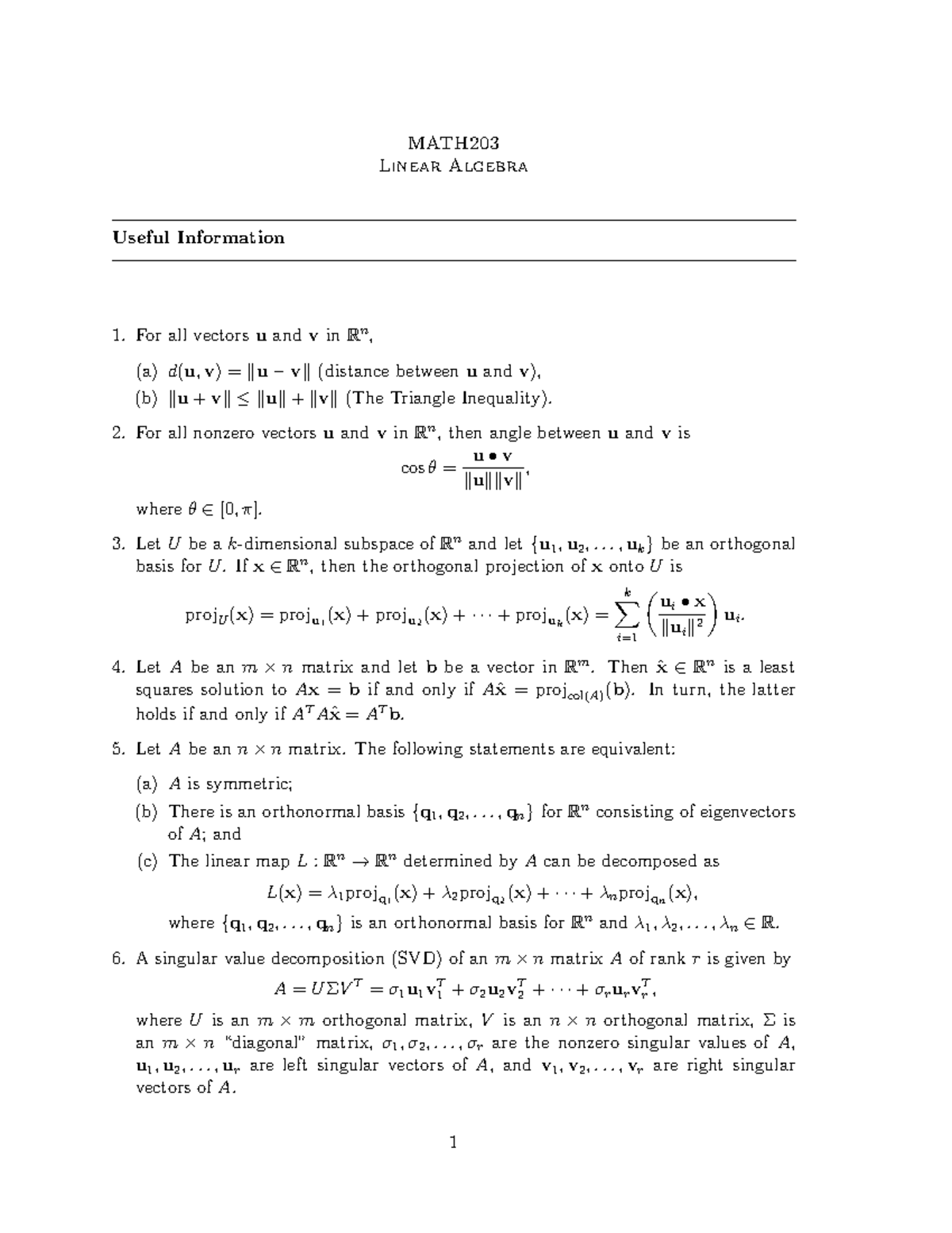 MATH203 Linear Algebra: Key Concepts and Formulas - Studocu