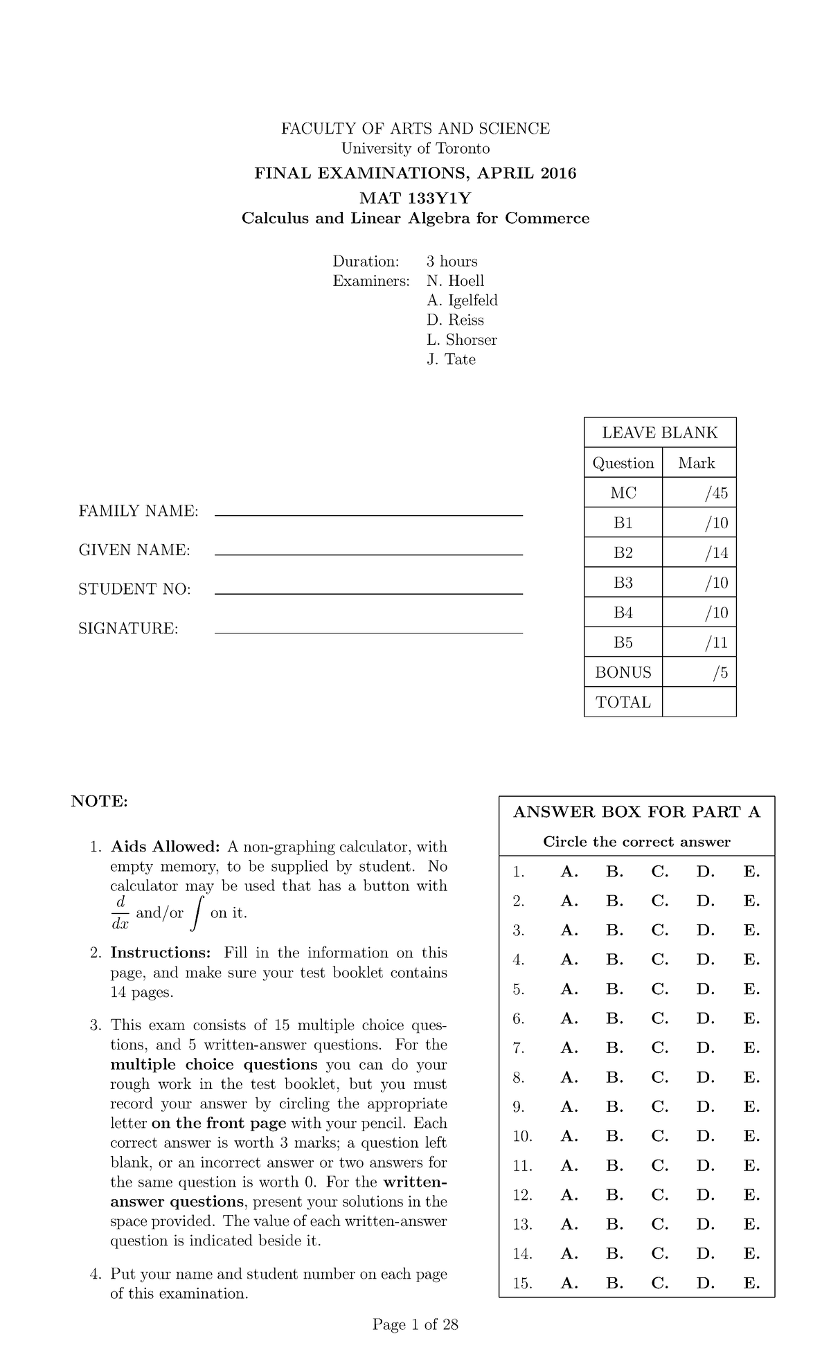 MAT 133Y1Y Final Exam Solutions - Calculus & Linear Algebra 2016 - Studocu