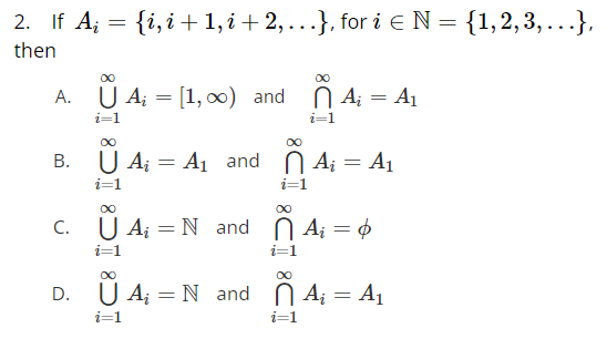 Solved Ai={i,i+1,i+2,…}, for i∈N={1,2,3,…}⋃i=1∞Ai=[1,∞) and | Chegg.com