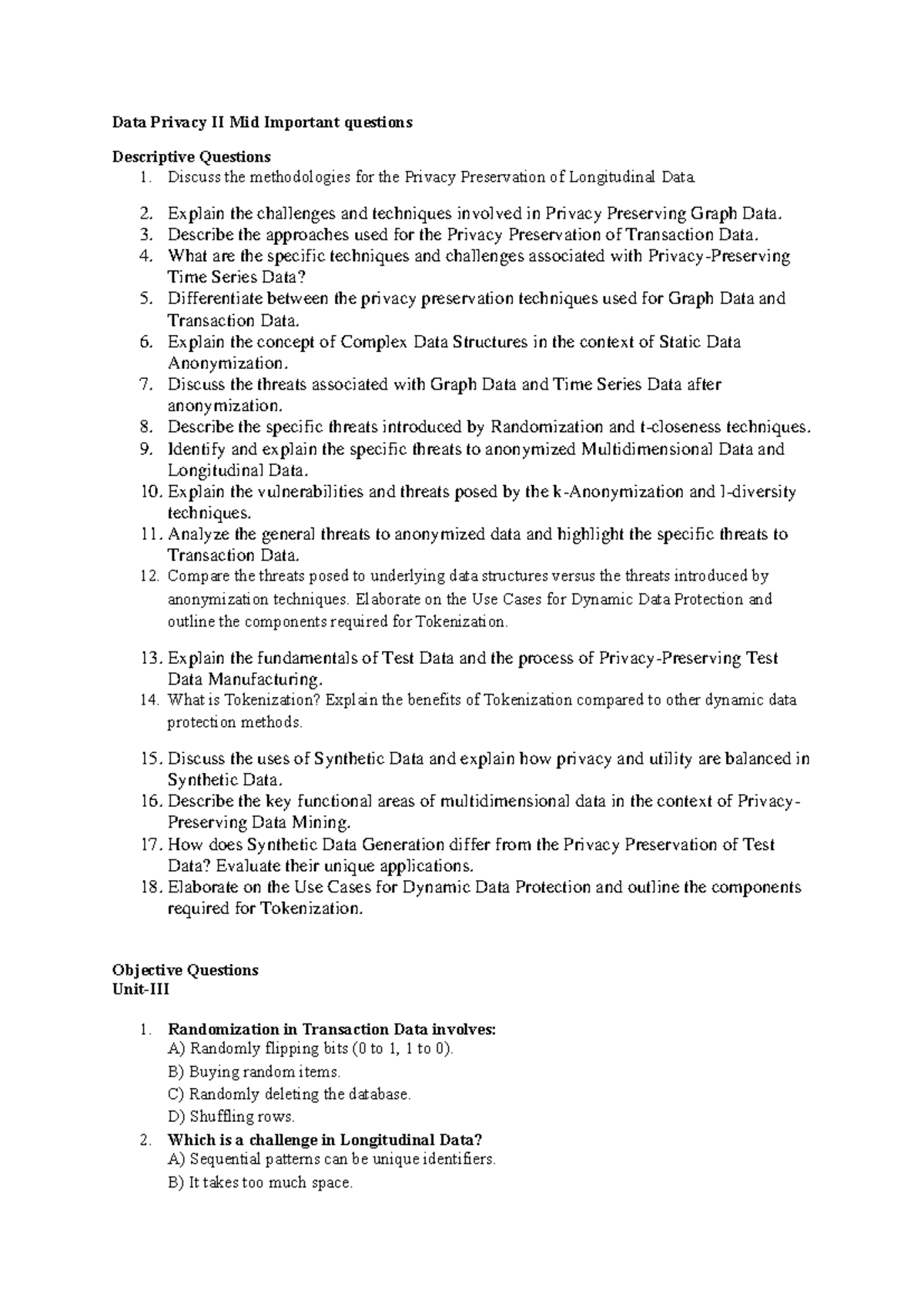DP II Midterm Important Questions on Privacy Preservation Techniques ...