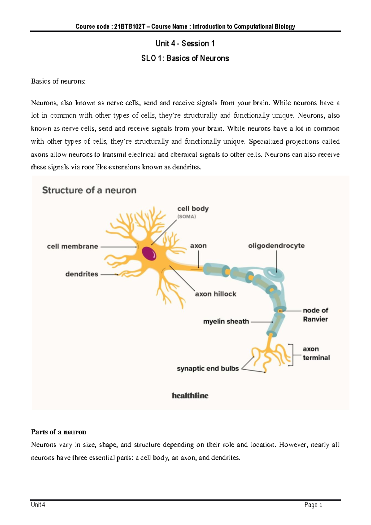 21BTB102T: Unit 4 Notes on Neurons and Neural Networks in Computational ...