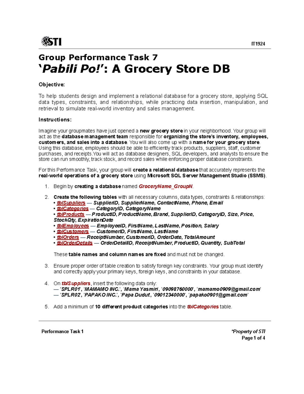 IT1924 Group Performance Task 7: Grocery Store DB Design ...