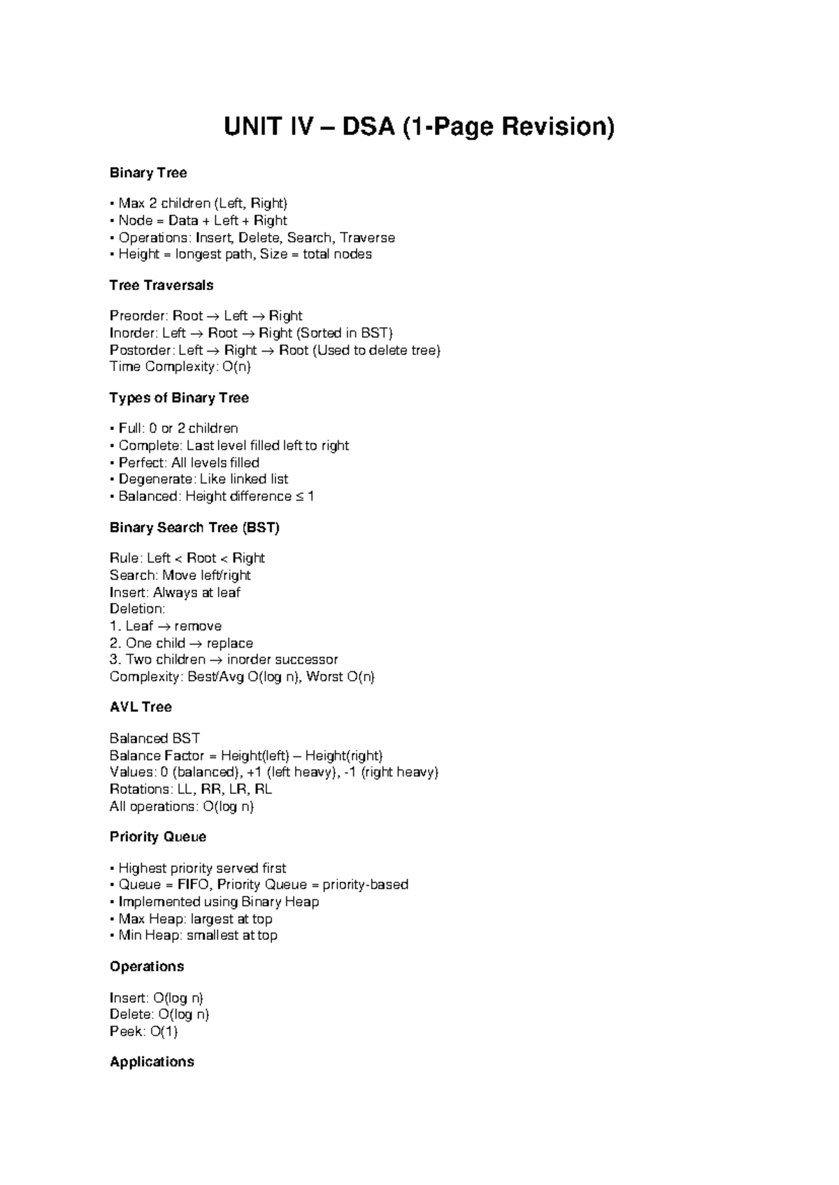 DSA Unit IV Revision: Binary Trees & Operations Overview - Studocu