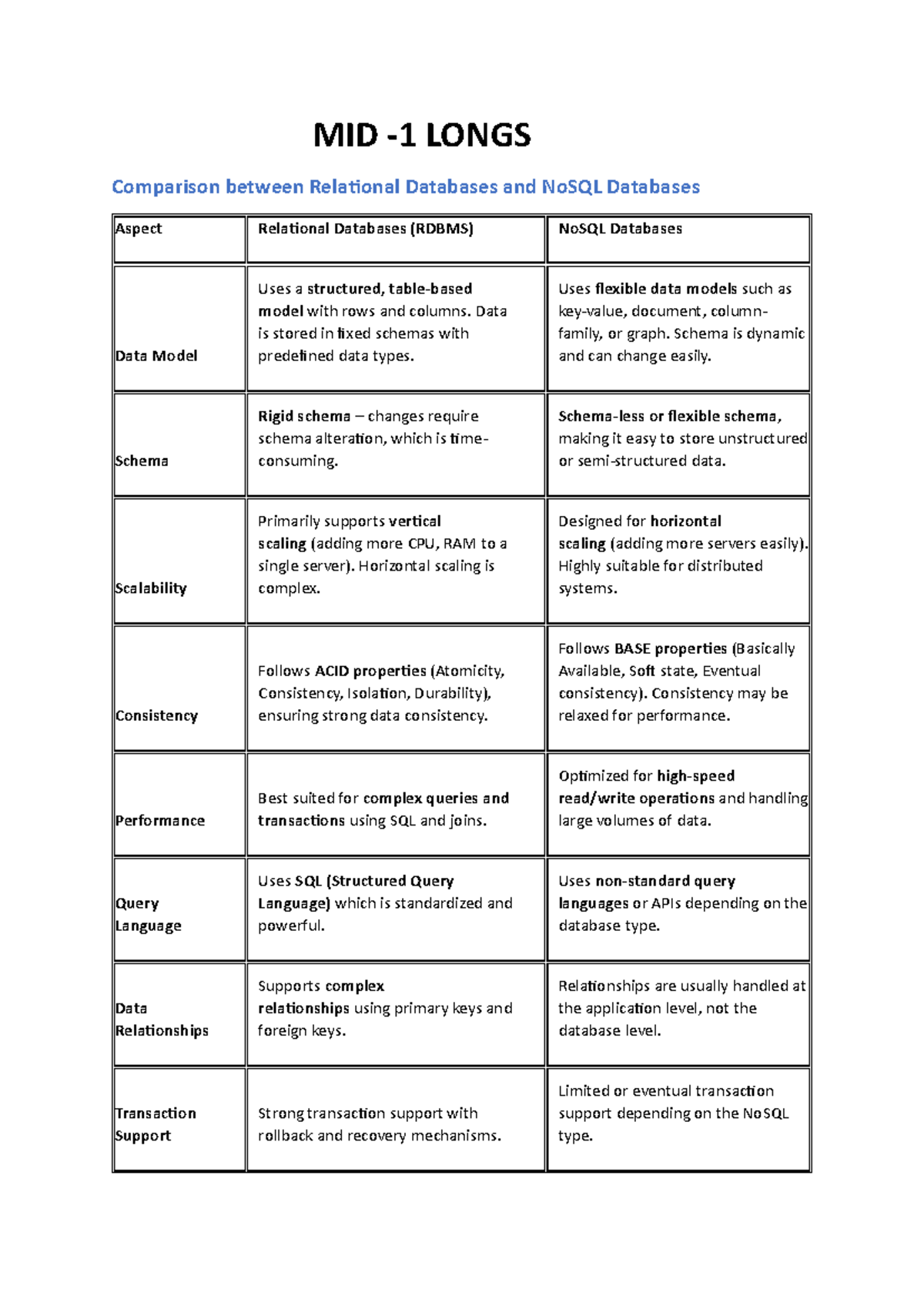 NoSQL MID 1 Long Answers: RDBMS vs NoSQL Databases Comparison and ...