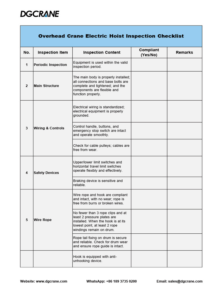 Overhead Crane Electric Hoist Inspection Checklist | PDF | Crane ...