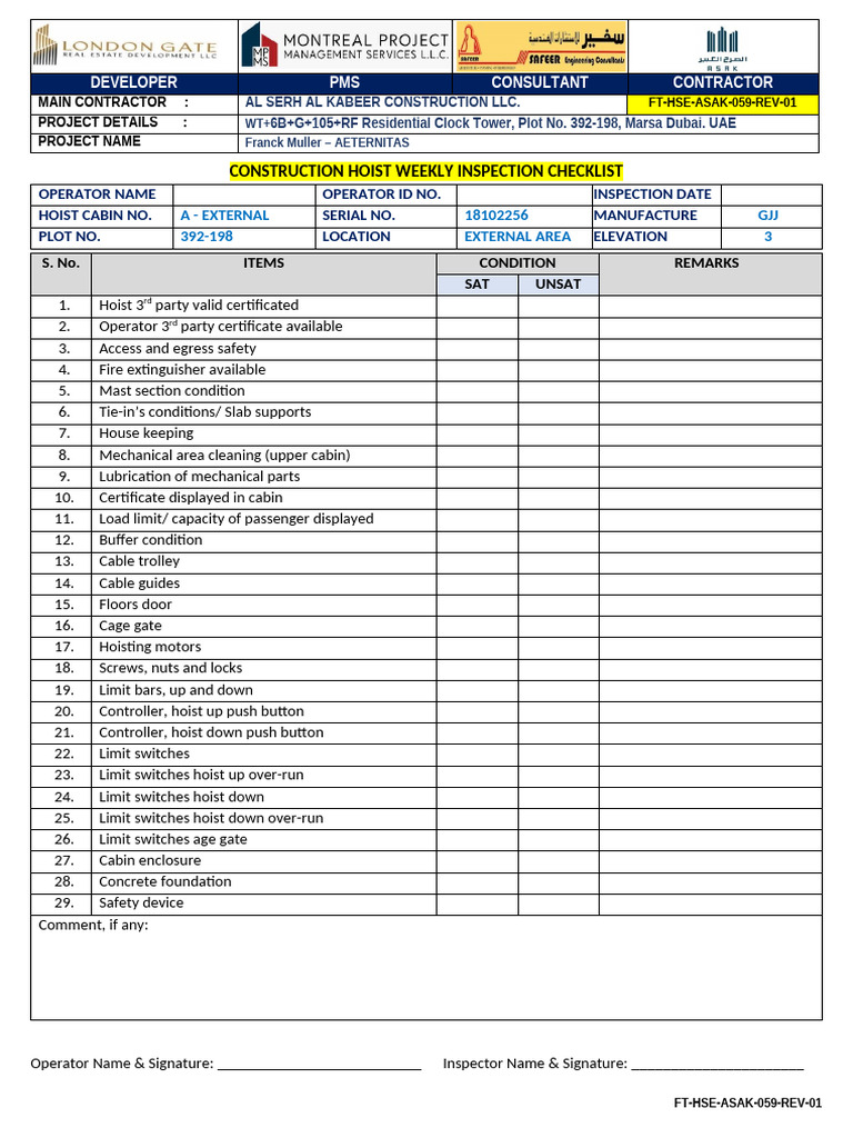 Construction Hoist Inspection Checklist | PDF