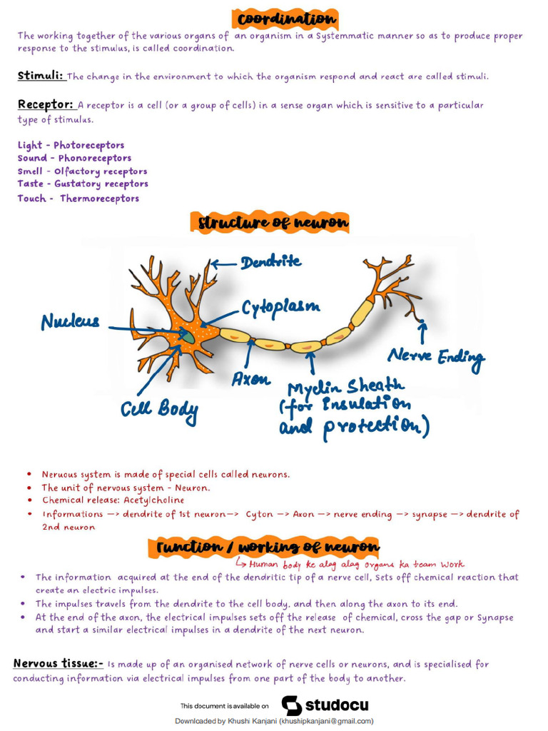 Chapter 6 Control and Coordination CW Notes | PDF | Neuron | Axon