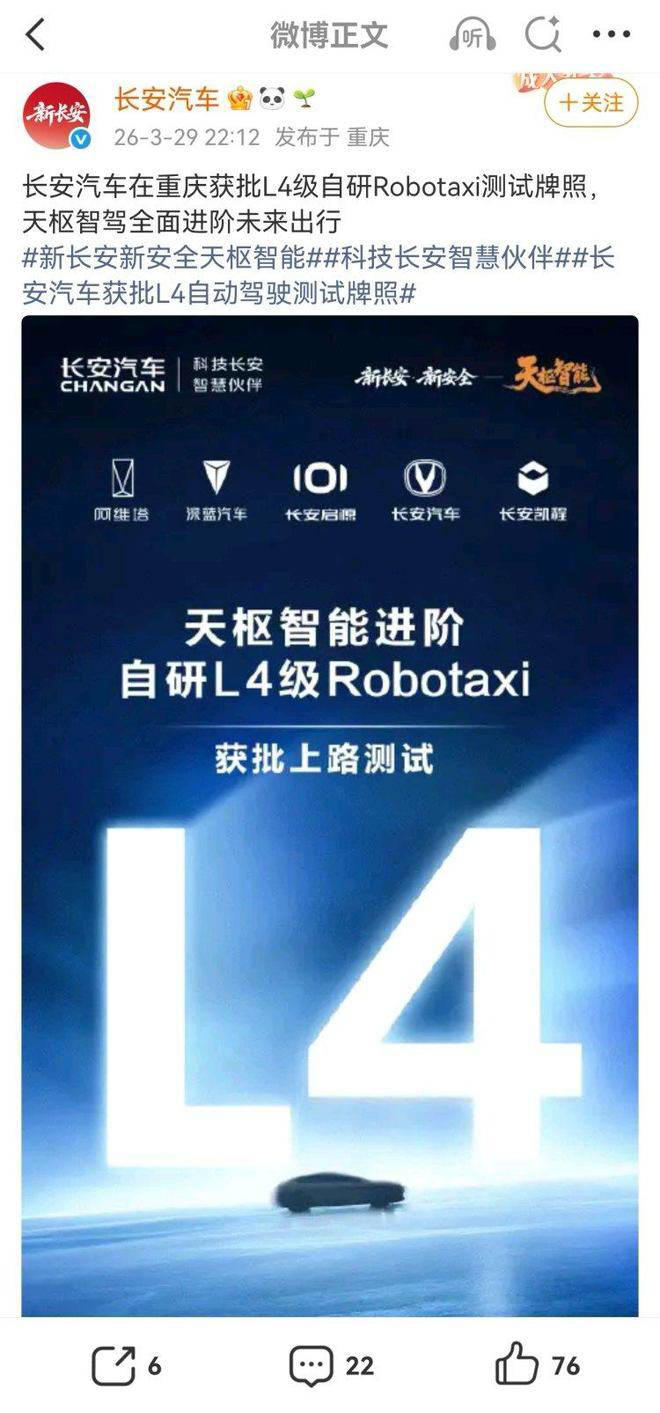 长安汽车:长安汽车正式获批L4级Robotaxi测试牌照
