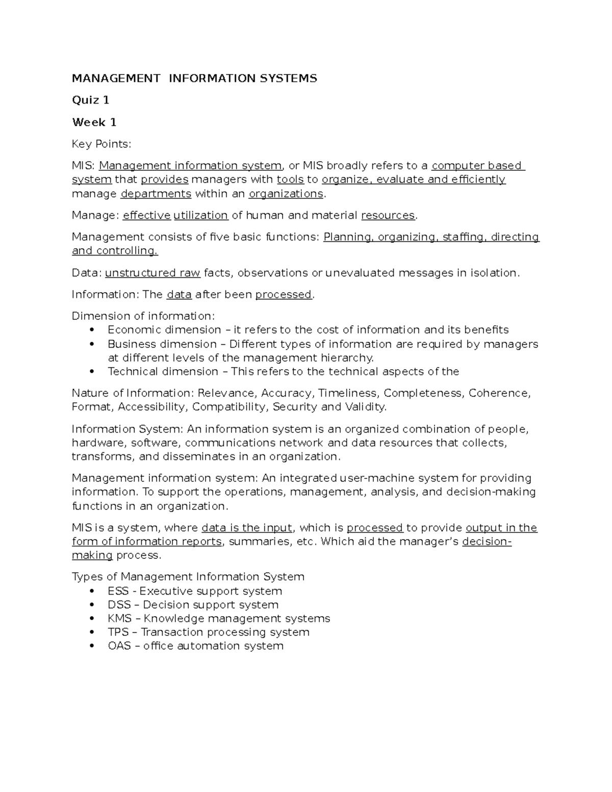 Quiz 1 Key Points - MANAGEMENT INFORMATION SYSTEMS Quiz 1 Week 1 Key ...