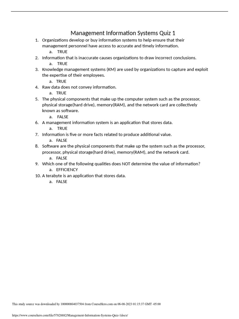 Management Information Systems Quiz 1 | PDF
