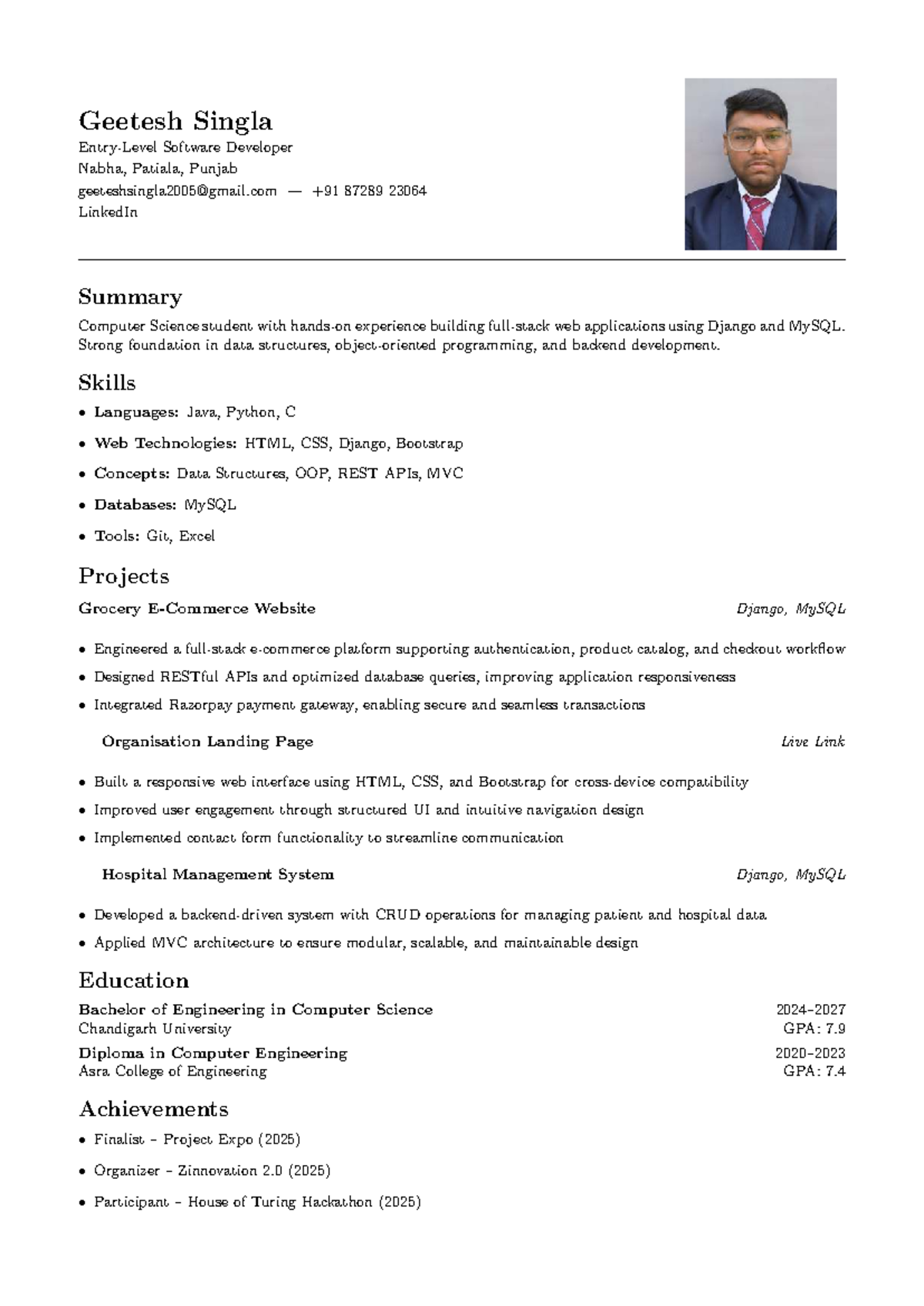 Resume Template for Software Developer (CS 101) - Geetesh Singla - Studocu