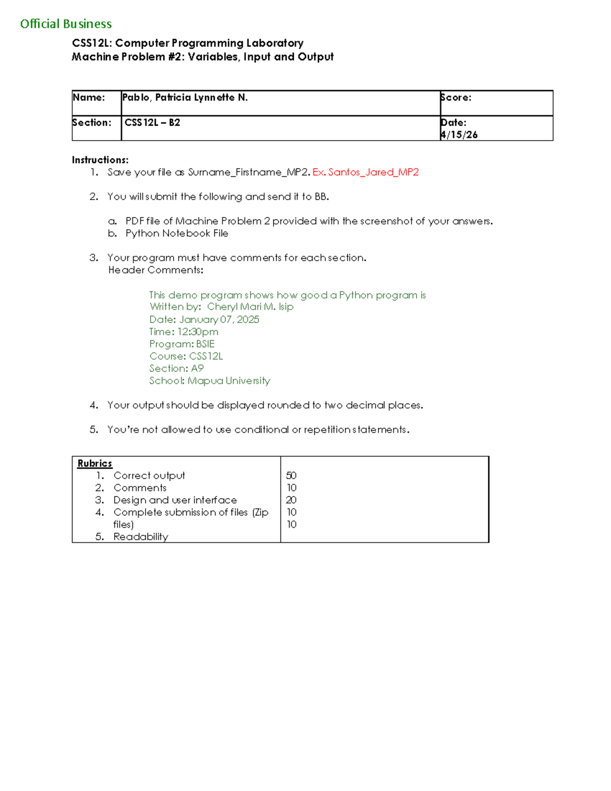 CSS12L: MP2 - Python Program for Pool Calculations and Output - Studocu