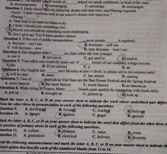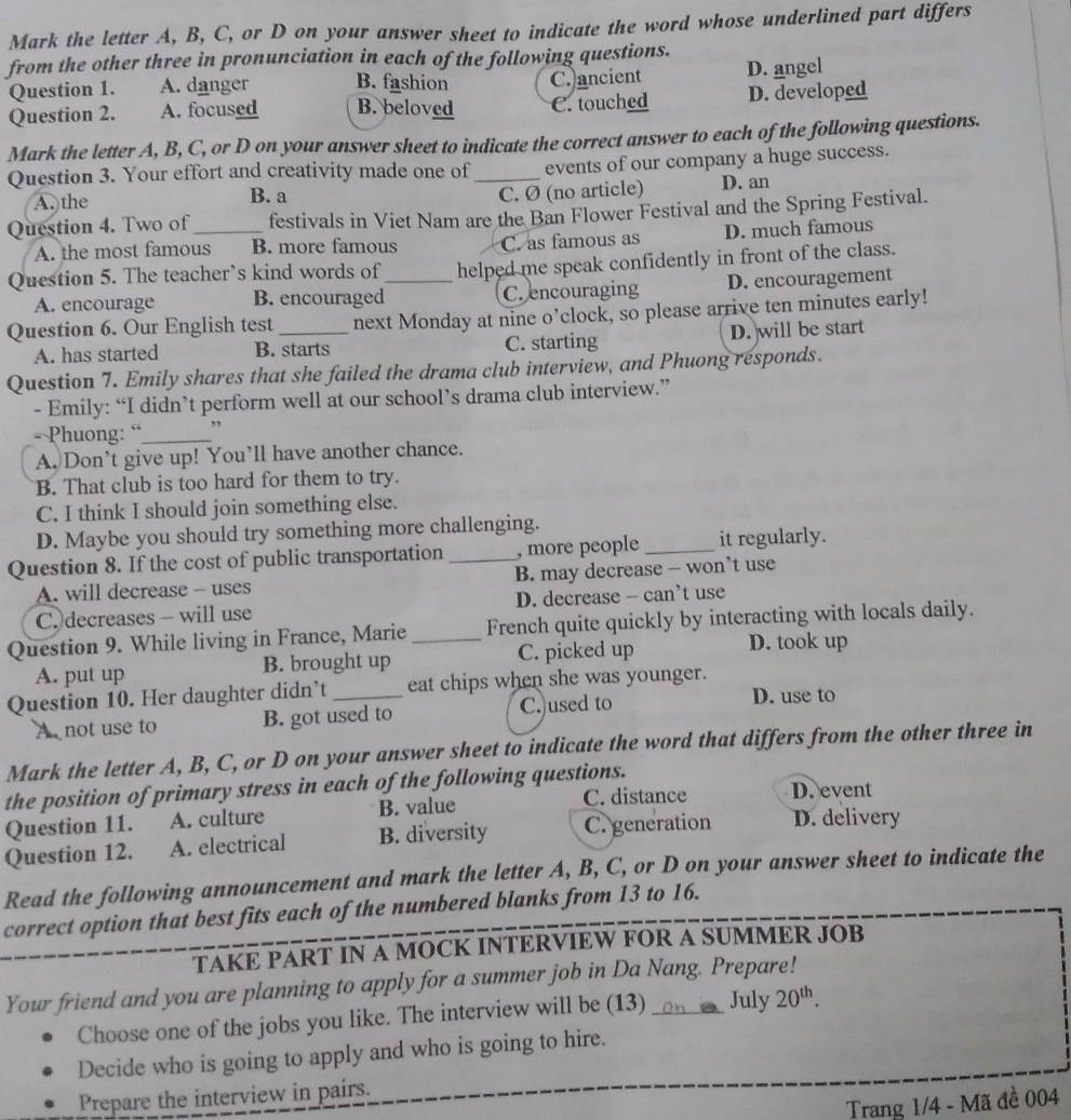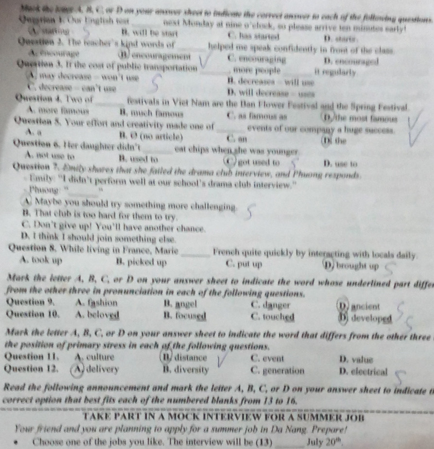 Giải quyết:Mack the loae A. B. C. or D on your answer sheet to indiene ...