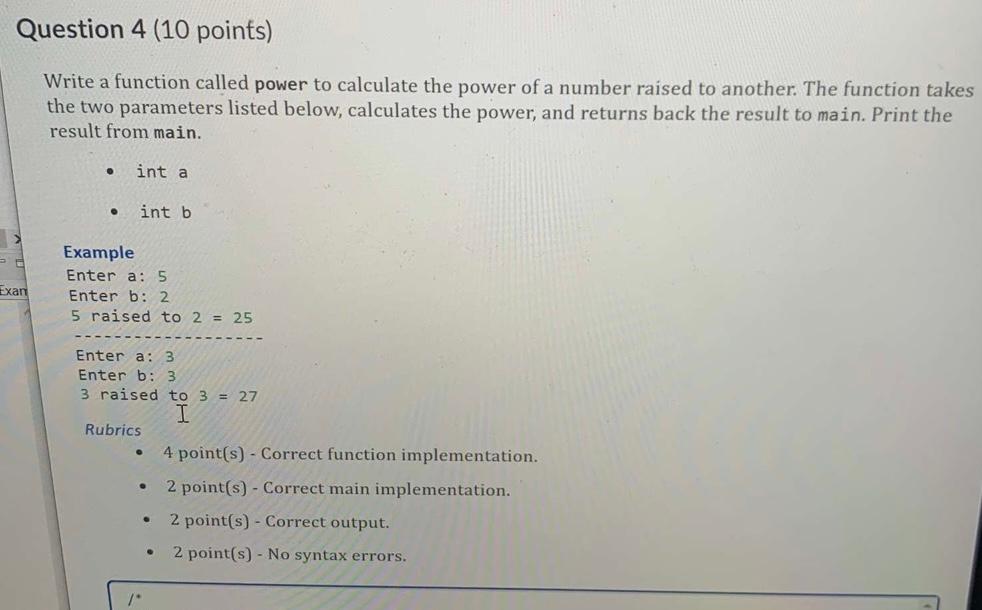 Solved Question 4 (10 points) Write a function called power | Chegg.com