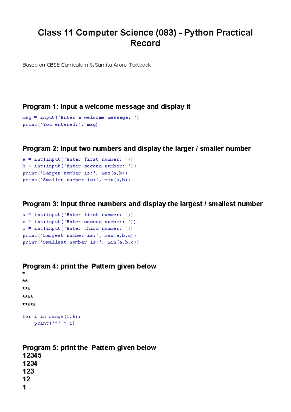 Class 11 Computer Science (083) Python Practical Record - Studocu