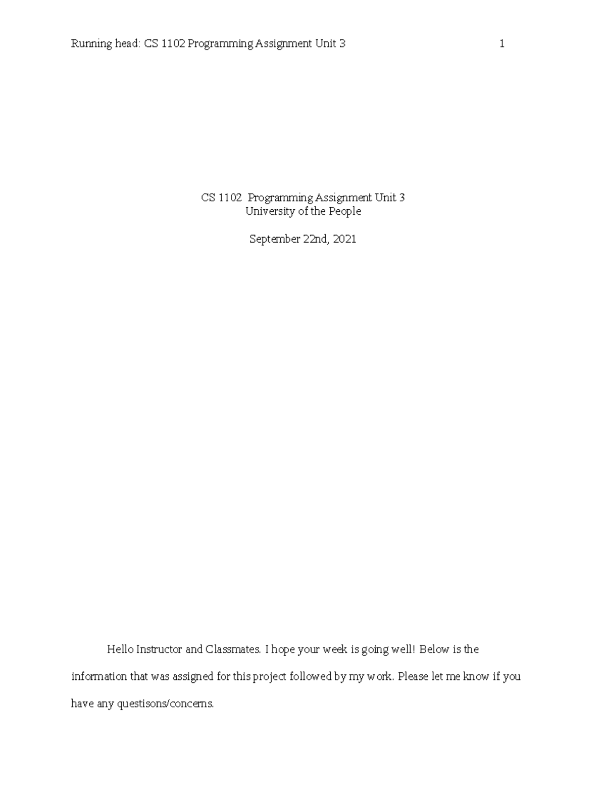 Programming Assignment Unit 1 - CS 1102 - Studocu