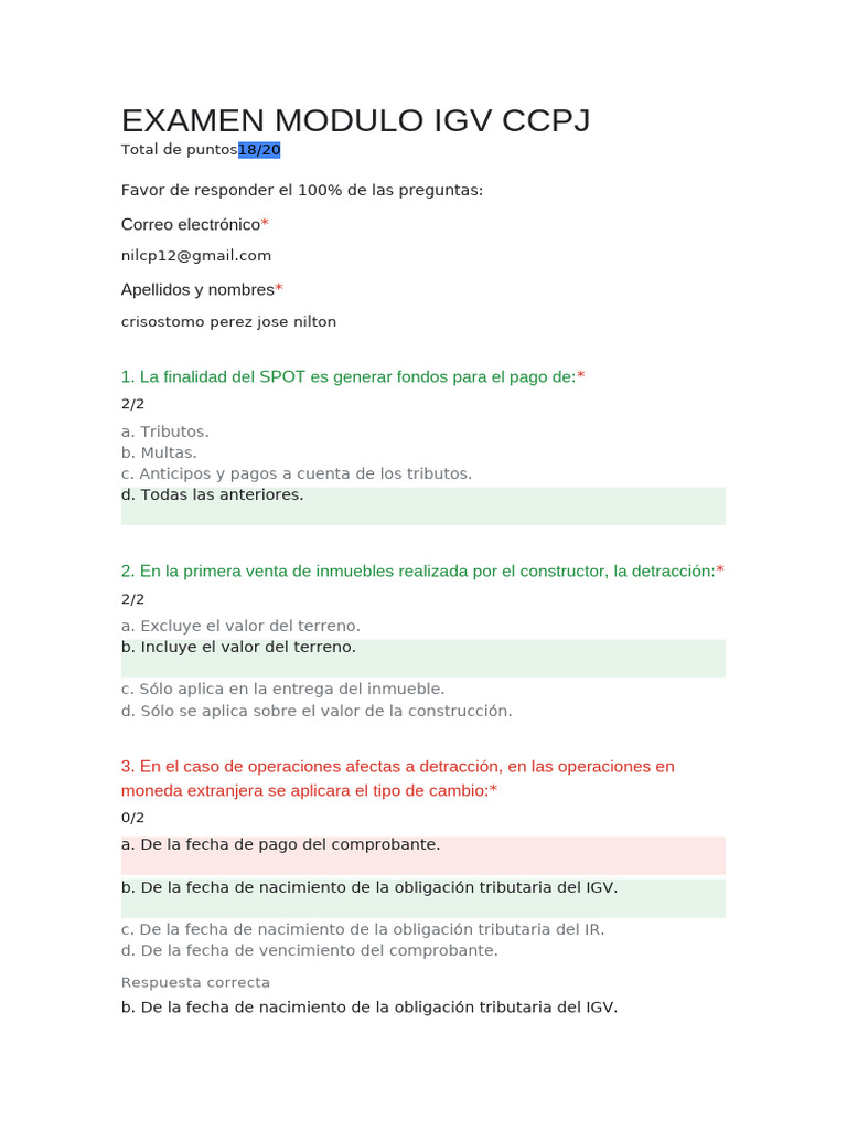 Examen IGV CCPJ: Preguntas y Respuestas | PDF