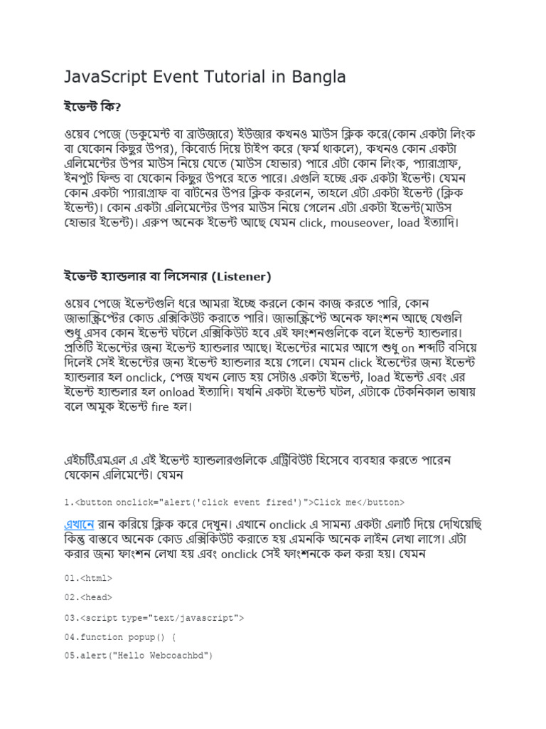 Based on this image's title: “JavaScript Event Tutorial in Bangla | PDF”
