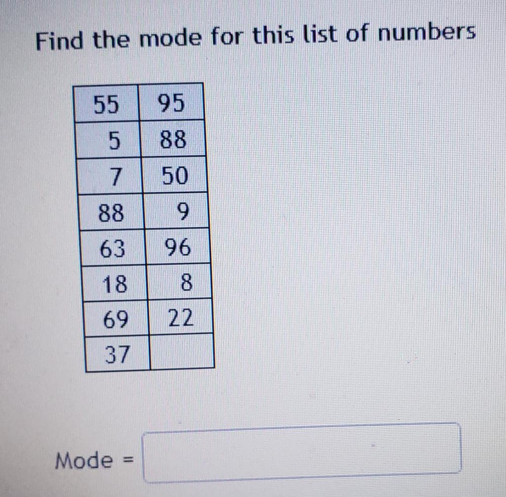 Solved Find the mode for this list of numbers 55 95 5 88 7 | Chegg.com