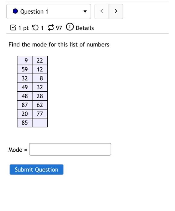 Solved Question 1 > Ø 1 pt 51 97 Details Find the mode for | Chegg.com