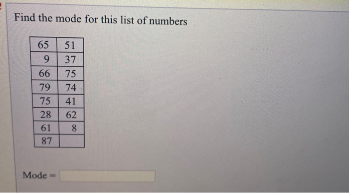 Solved Find the mode for this list of numbers 65 9 66 79 75 | Chegg.com