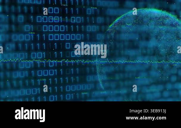 Frames advancing, binary matrix scrolling while particle globe forming ...