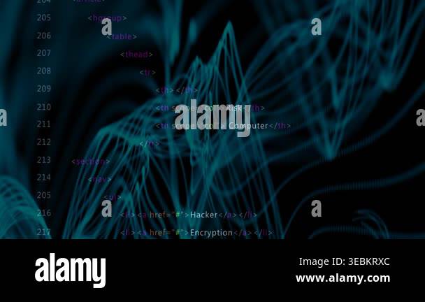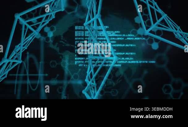 Camera shifting, cyan 3D lattice revealing dotted globe while code ...