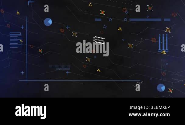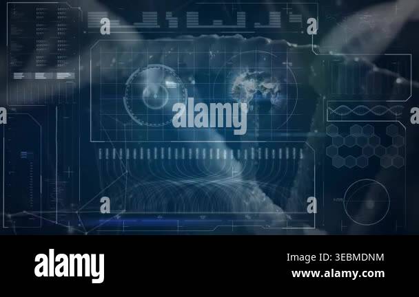 Bar chart and grid sphere animation over blue gradient background. data ...