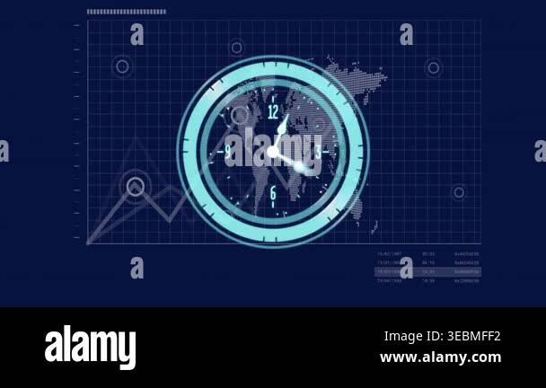 Clock animation over world map with data graphs and charts. Time ...