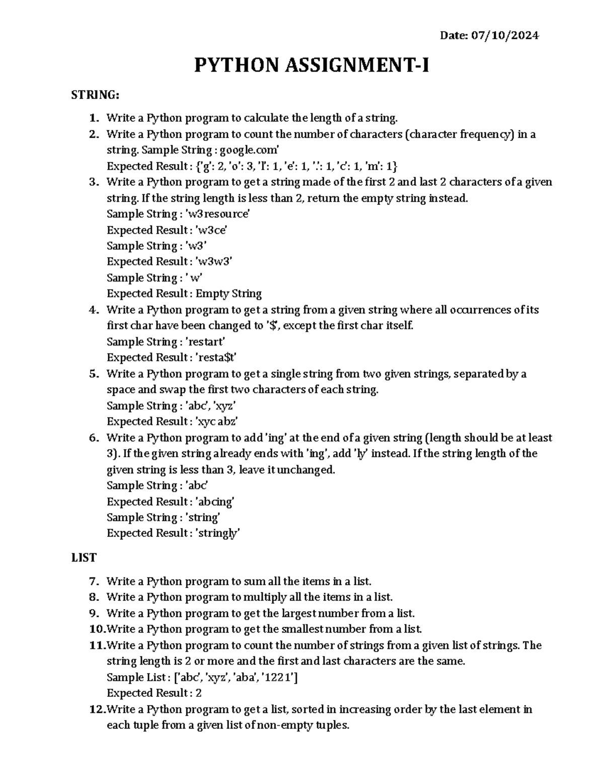 Python Assignment I - String, List, Tuple & Dictionary Problems - Studocu