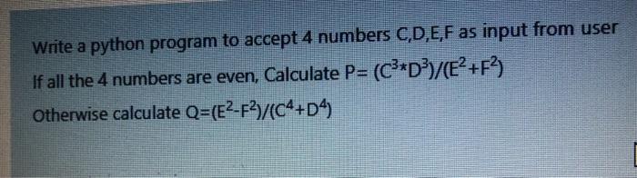 Solved Write a python program to accept 4 numbers C,D,E,F as | Chegg.com