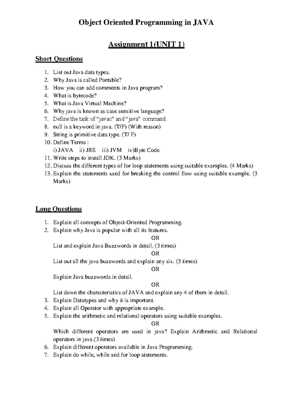 Assignment 1 - Short and Long Questions on OOP in JAVA (UNIT 1) - Studocu