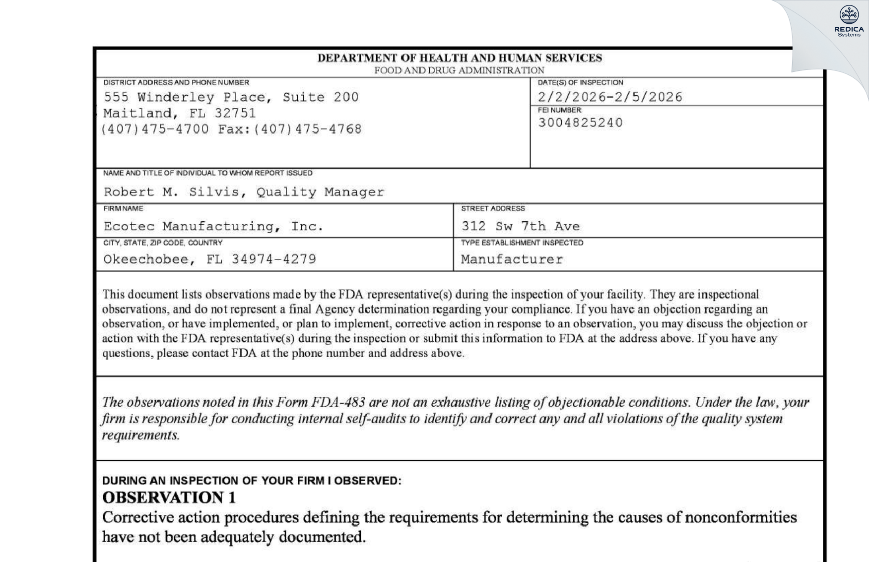 Ecotec Manufacturing, Inc. - Form 483, 2026-02-05 - Redica Systems Store