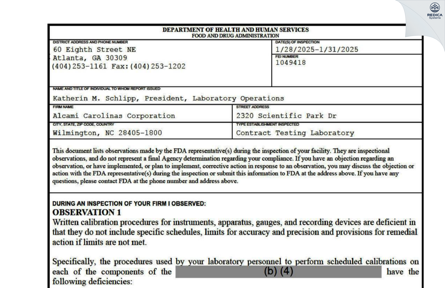 Alcami Carolinas Corporation - Form 483, 2025-01-31 - Redica Systems Store